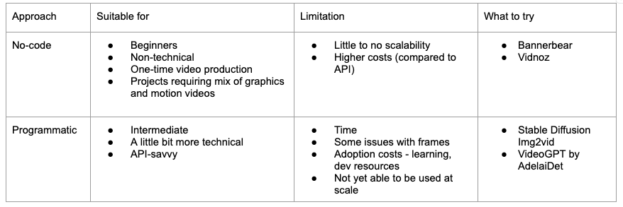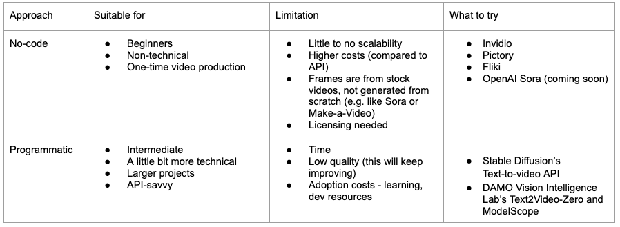 I highly recommend this blog post by Hugging Face for a further deep-dive and demos of existing models. My personal opinion on text-to-video software and APIs is that they would be able to supplement a person-to-camera set-up, but not replace the need of it entirely, especially with brand content, targeting informational and commercial intent.