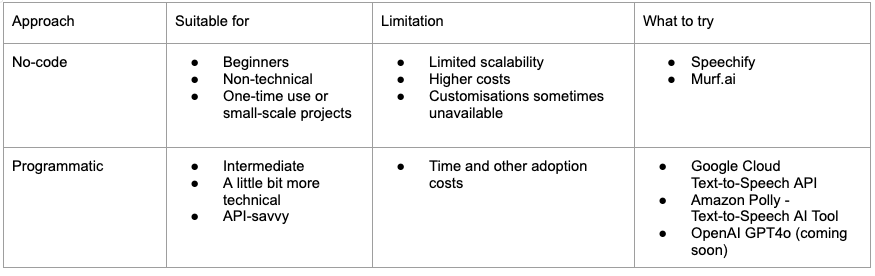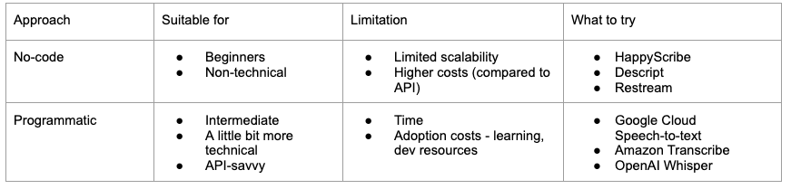 I highly recommend checking out the programmatic approaches, as some like OpenAI’s speech-to-text functionalities can be incorporated into processes easily, even by complete beginners, with no coding experience.