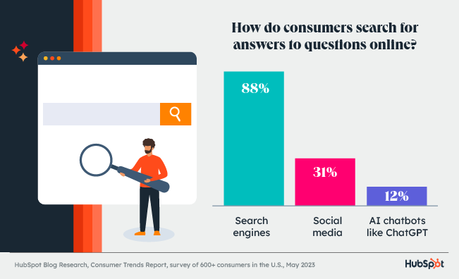 We now have more places than ever that we can go to to find information - not only search engines, but social media, and most recently - AI chatbots like ChatGPT. Research by Hubspot shows that 31% of people search on social media, while 12% now use AI chatbots to find answers.