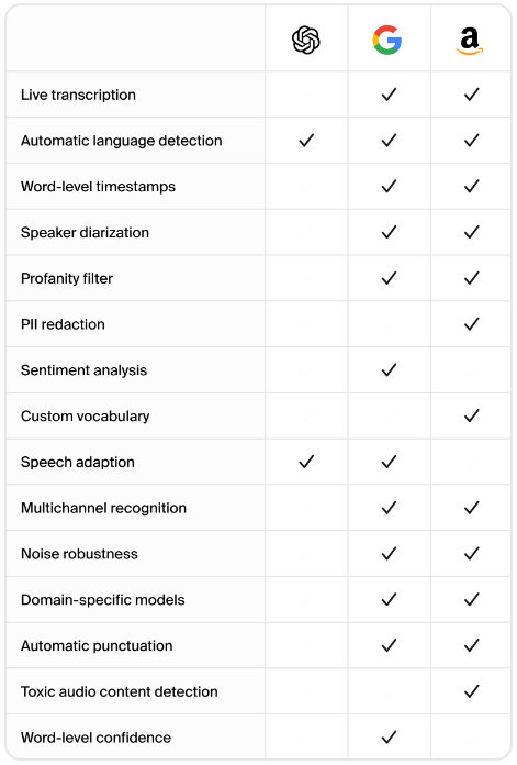 When it comes to the programmatic approaches mentioned, Gladia’s blog post includes some pretty interesting insights. In short, OpenAI, Cloud Speech-to-Text, and Amazon Transcribe all have automated punctuation features, and automatically detect language. Cloud Speech-to-Text and Amazon Transcribe have other advanced features making them more superior than OpenAI.