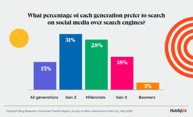 What percentage of each generation prefer to search on social media over search engines? - Hubspot Blog Research, 2023.