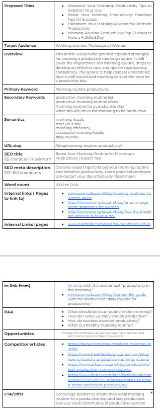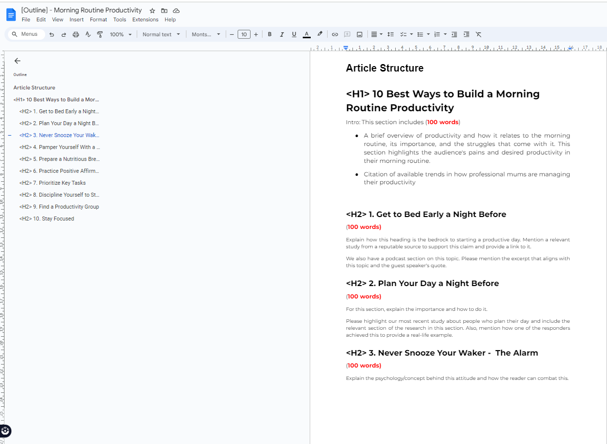 Let’s imagine we’re working on an outline for the topic: “How to Create a Morning Routine for Increased Productivity”. Our aim with this content is to help our target audience (professional women) develop and maintain a good morning routine that can help them have a productive day.