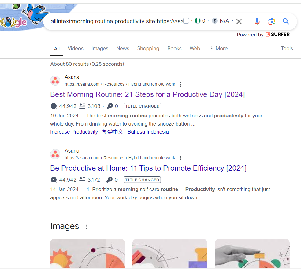 For example, allintext:morning routine productivity site:https://asana.com/ shows me all content with the keywords ‘morning,’ ‘productivity,’ ‘routine,’ or ‘morning routine productivity’ on Asana’s website. If I were creating this content outline for Asana this would be a great list of potential internal pages to consider linking to and from this content.