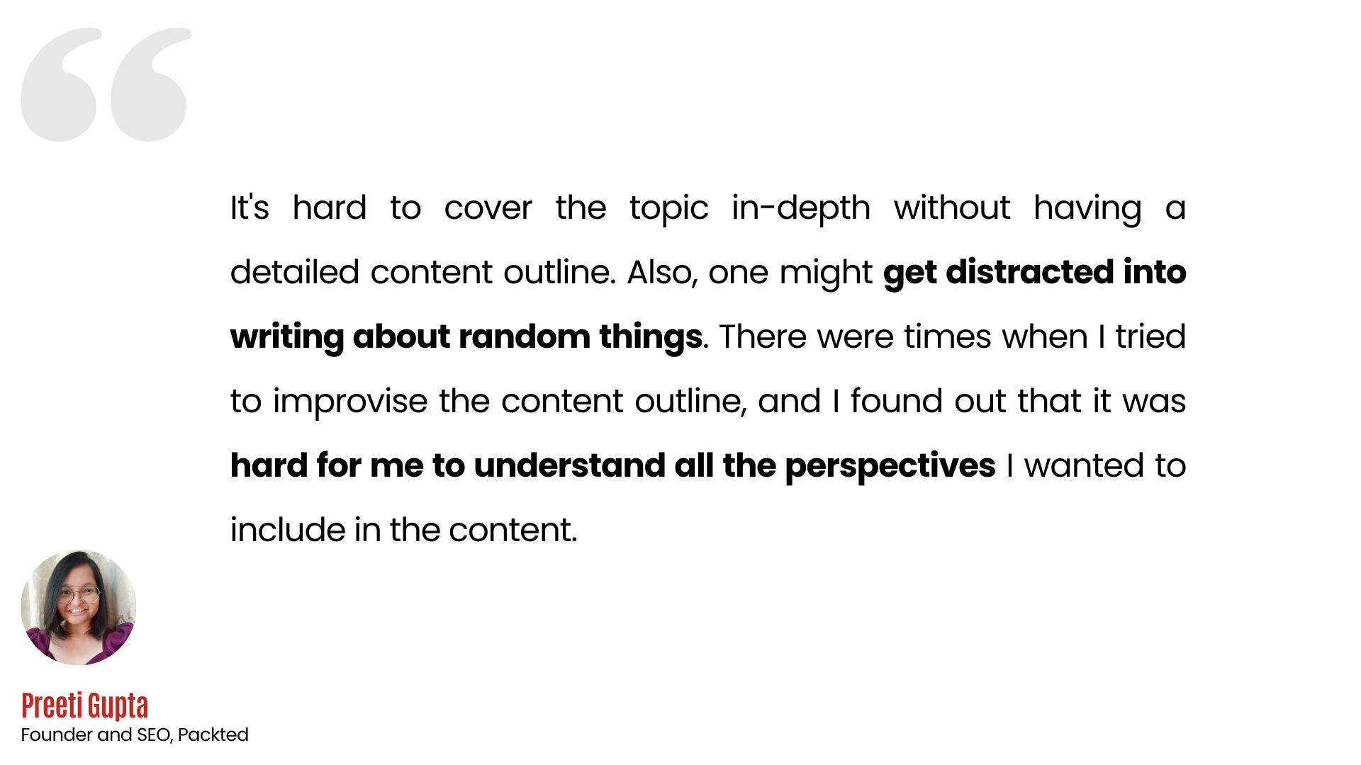 A detailed outline makes the writer’s job quicker and easier, and they can be confident that the content they are creating is fit for purpose. Preeti Gupta, Founder and SEO at Packted, says: