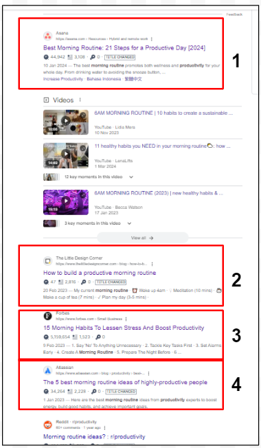 Here I’m looking to understand which pages are ranking well for the term: “morning routine productivity”. In the screenshot below you can see the SERP.