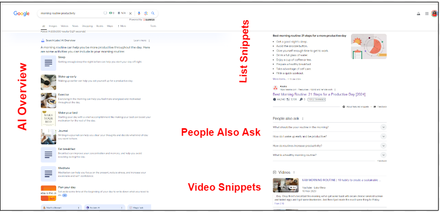 Here are the available opportunities on Google for my target keyword: AI overview, Videos, People Also Ask, and List snippets.