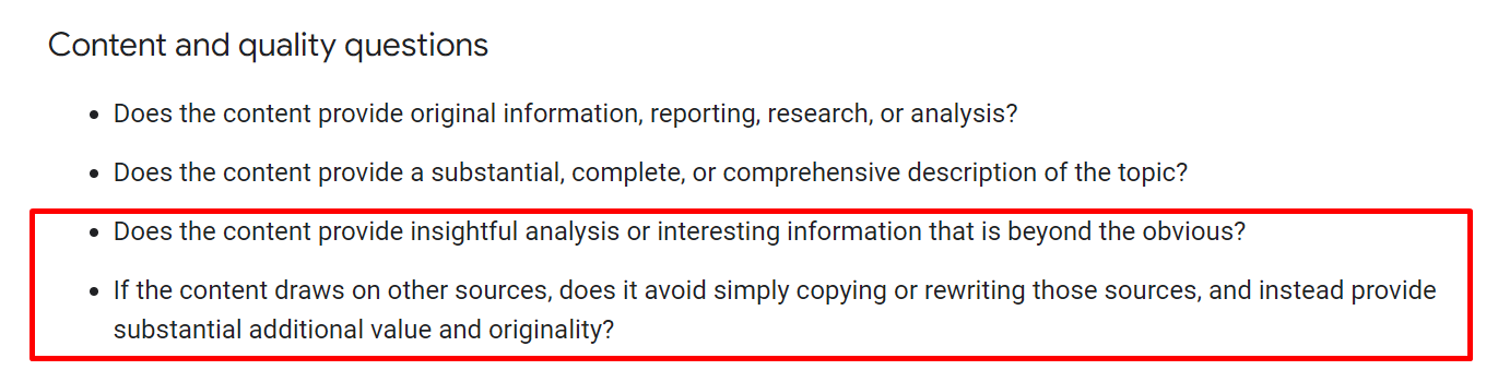 This statement also aligns with Google’s quality questions about finding a unique angle and ensuring your audience has the best experience.