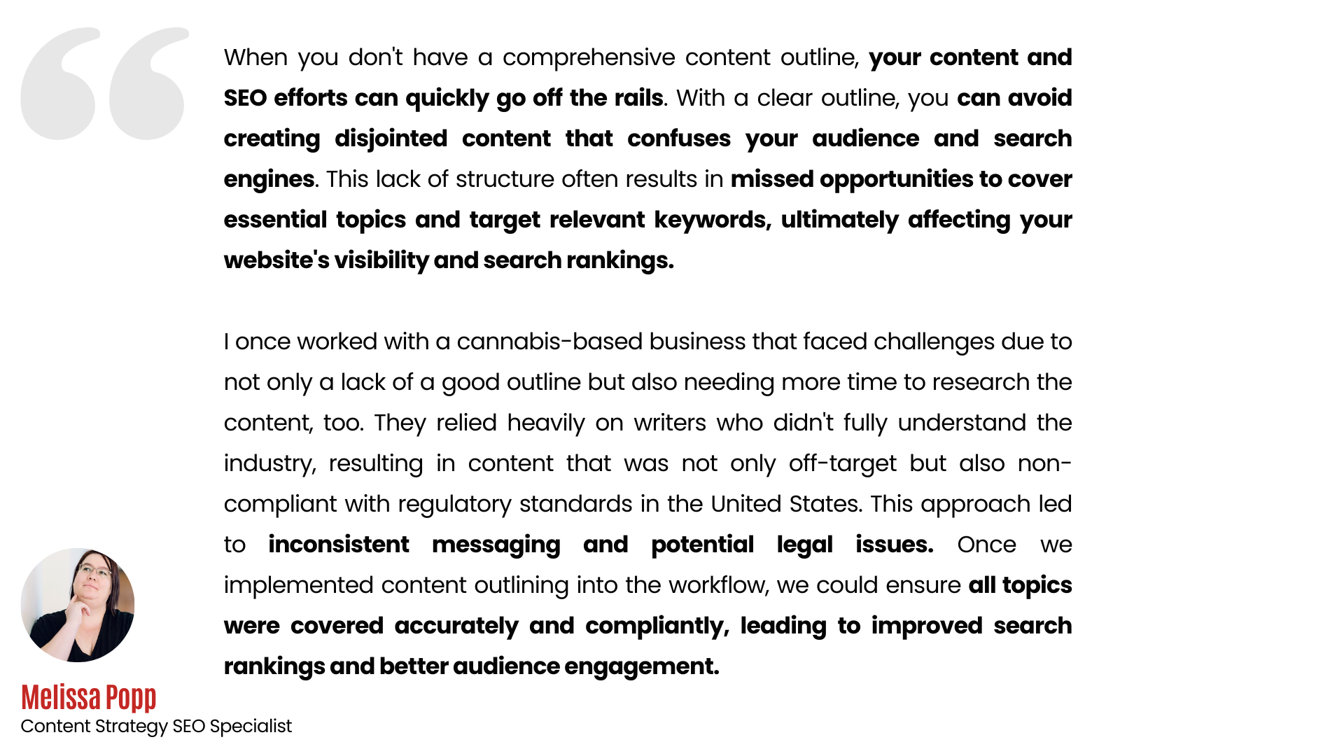 Failing to create a comprehensive content outline can lead to missed opportunities to rank, compliance issues, and more. Melissa Popps, Content Strategy Director at Rickety Roo, says: