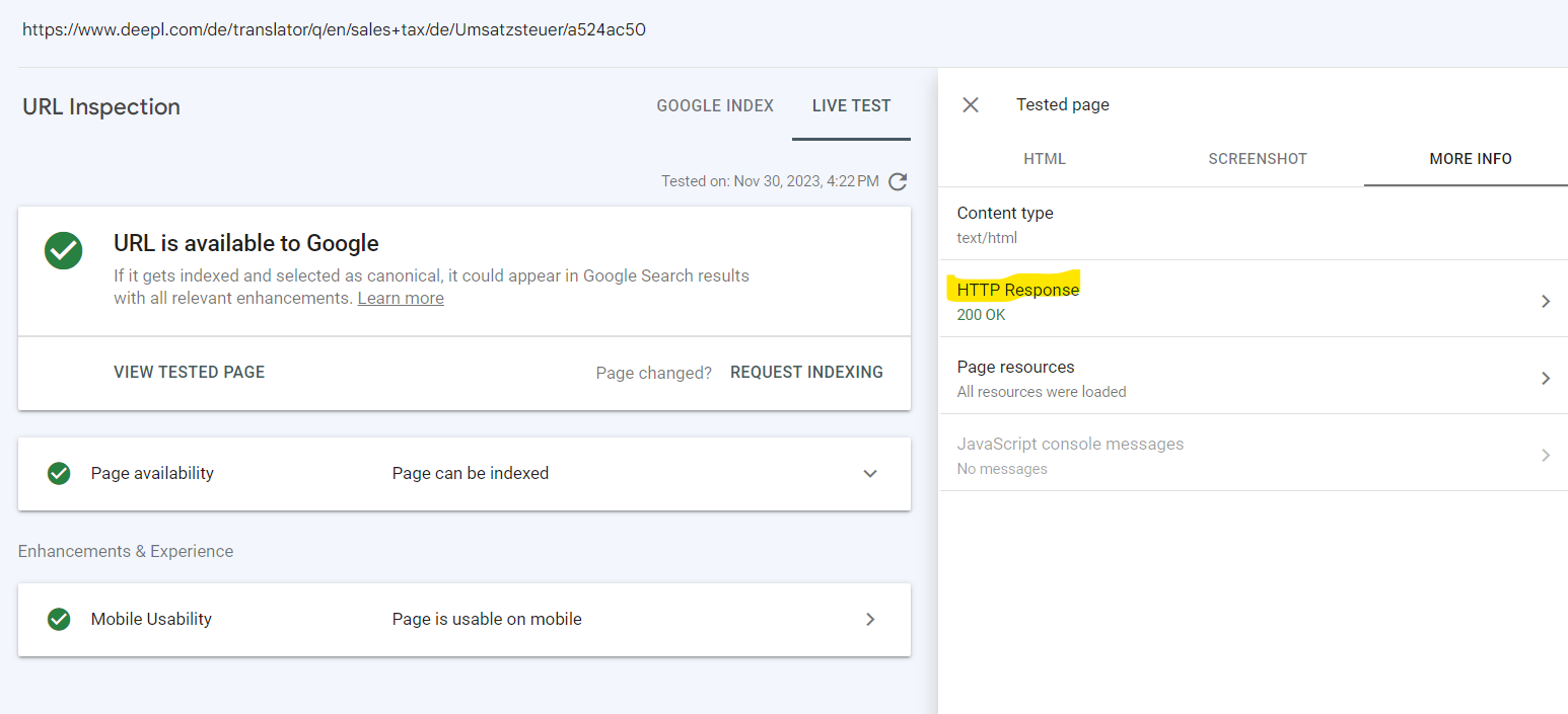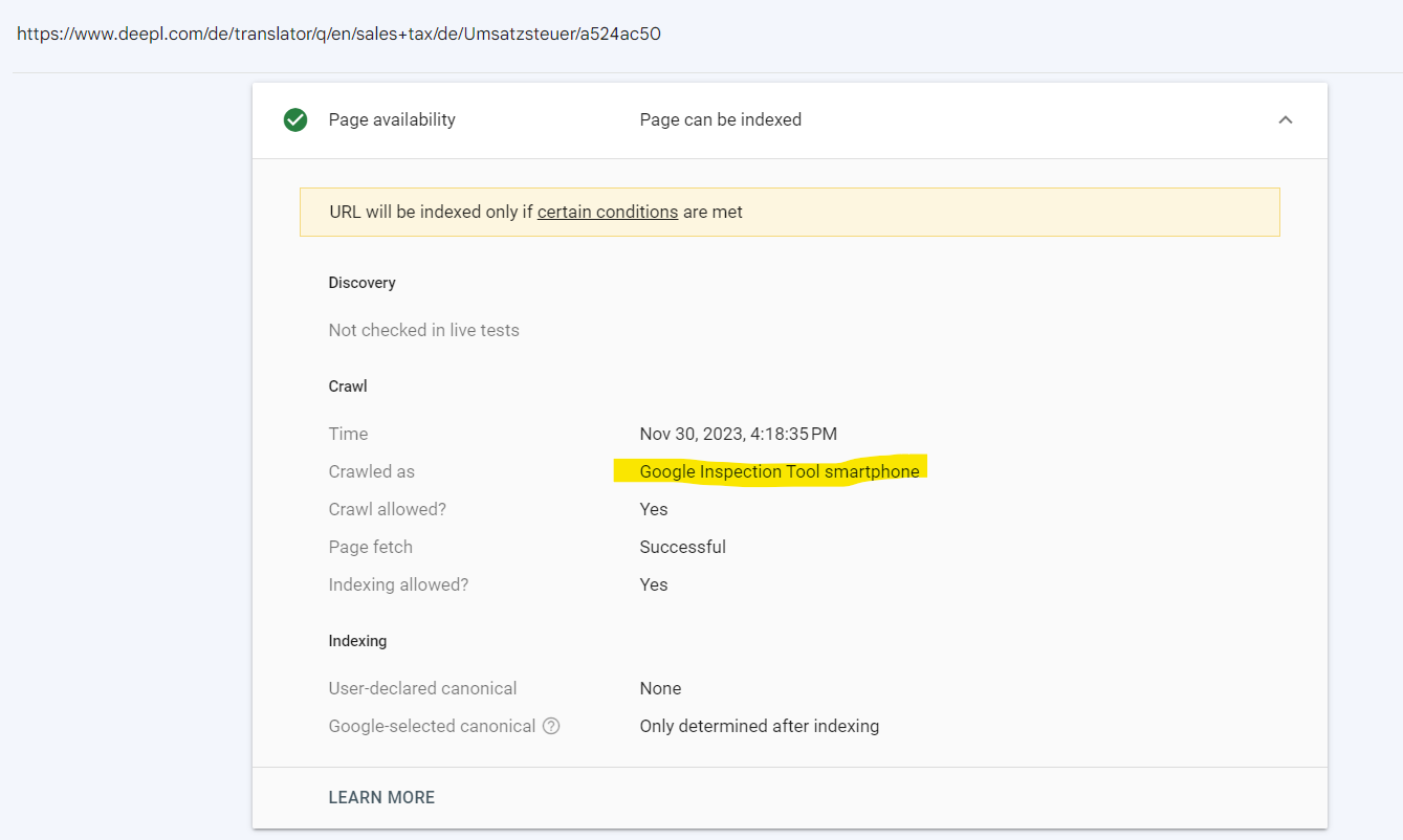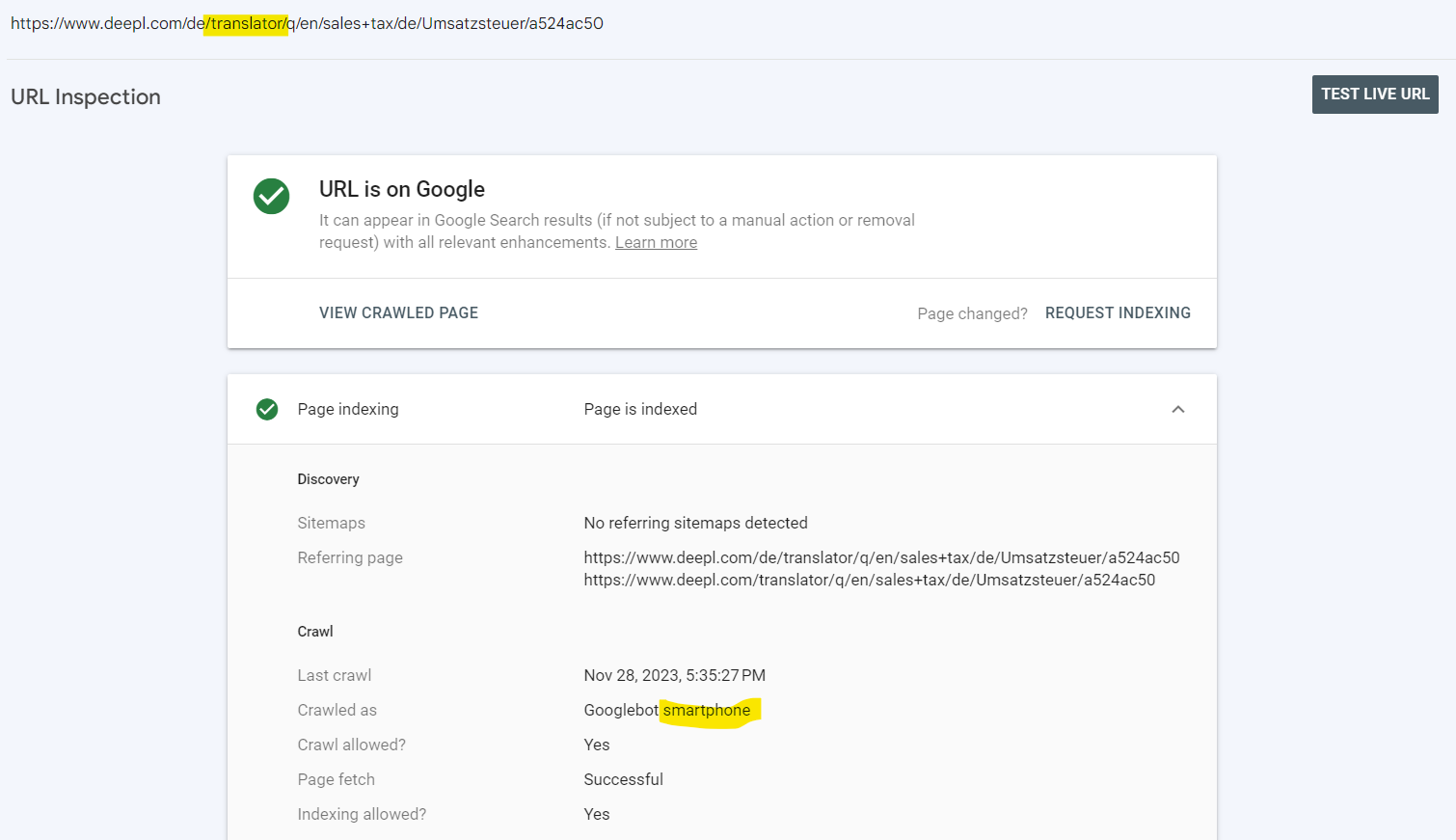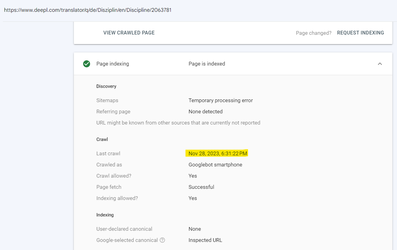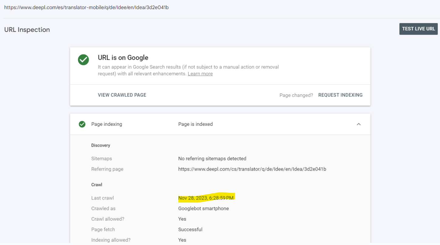 Another URL from the list at the beginning of this chapter: Allegedly not indexed as per 28.11.2023, yet upon inspection, indexed as per the last crawl on the same date: