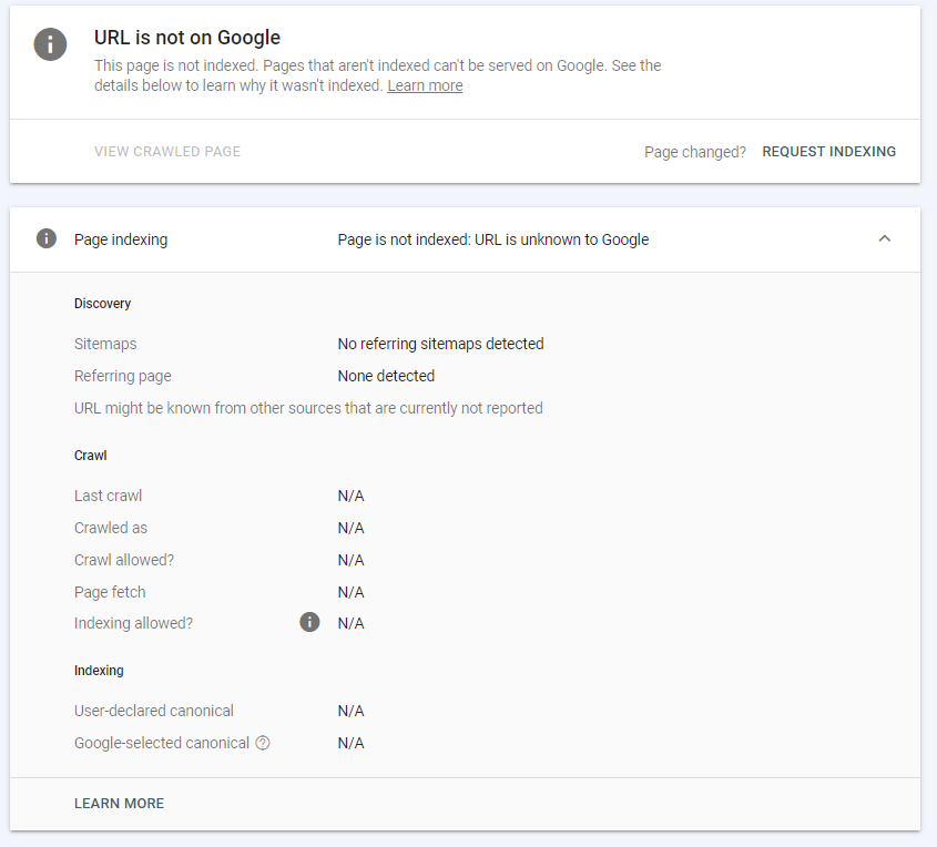 Another case of the URL Inspection being rather obscure: Let’s say you have a page with regular organic traffic, (so it must be indexed), and wanted to find additional information via the URL Inspection in GSC… imagine the sheer panic it can send you into if it claims that Google does not know this URL.