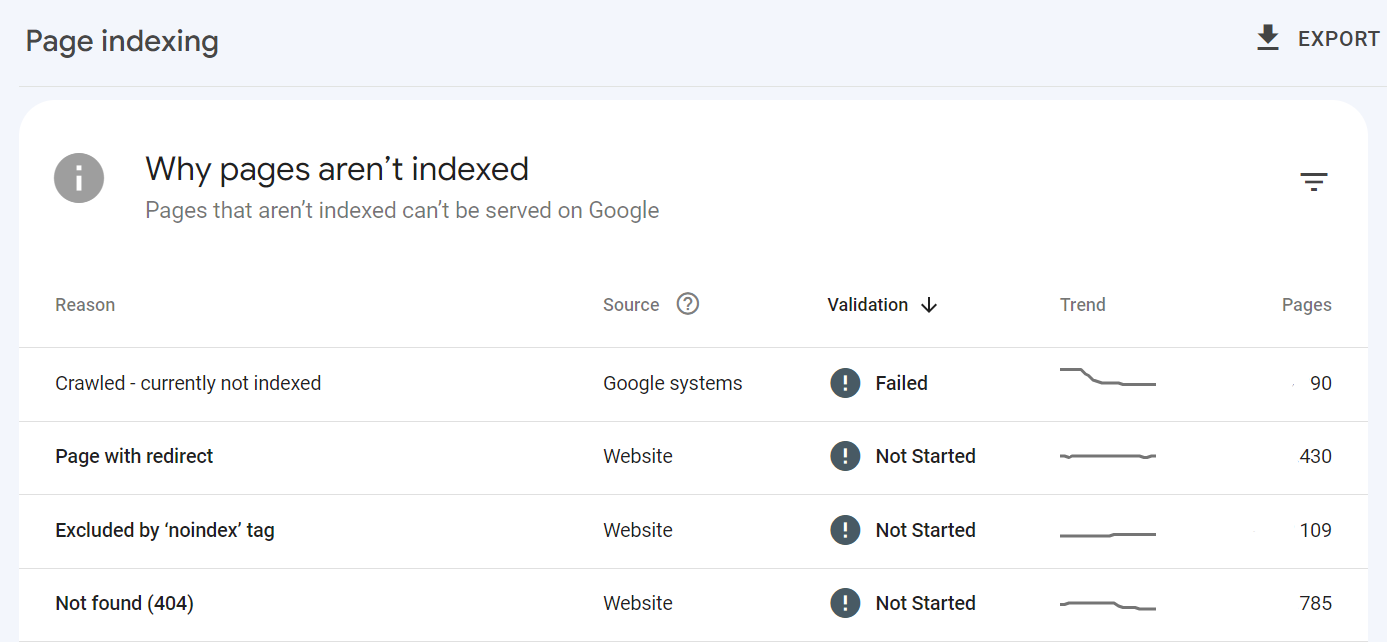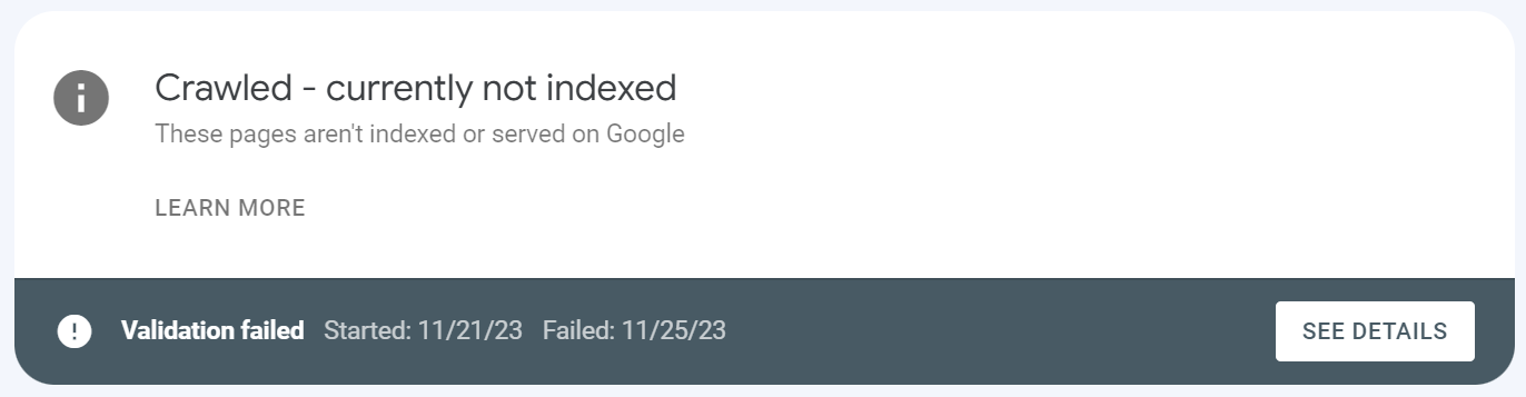 Even more painful: If you fix errors that affect a bunch of URLs in one of the error reports in GSC and ask for those to be revalidated, it will also test URLs in the same error class that have not been fixed, and validation will terminate early. GSC will tell you that validation stopped but it won’t tell you where, why, or which URLs it had successfully crawled and removed from the error report before it stopped validating.