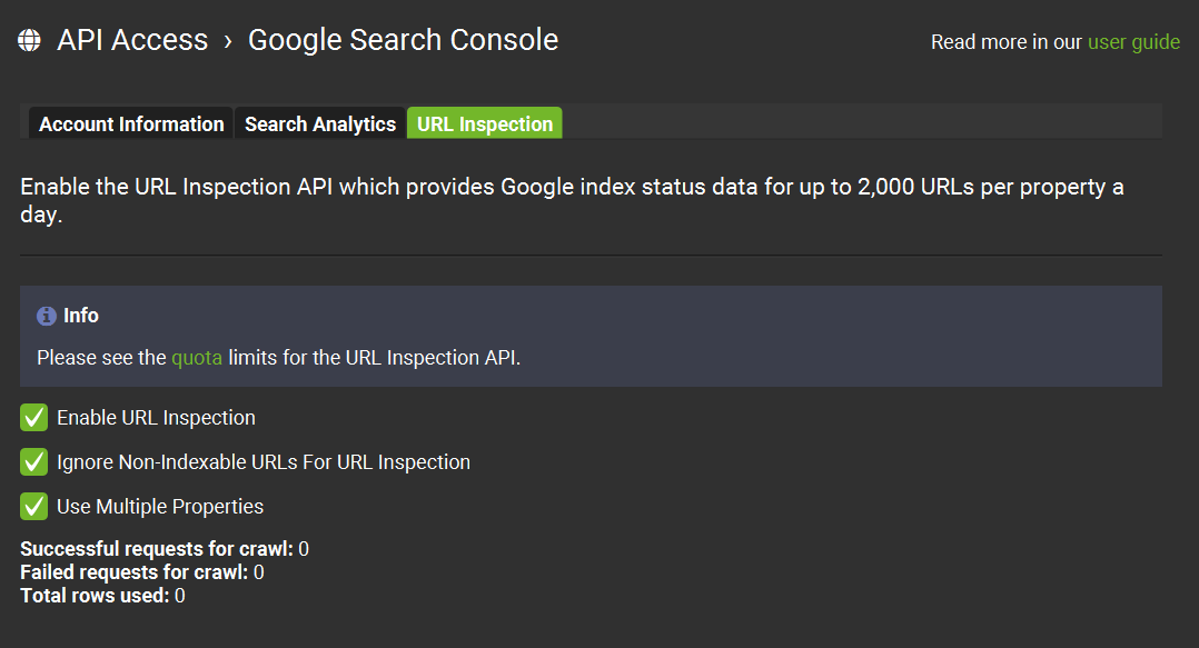 If you do not know how to send requests to Search Console API, our beloved Swiss Army Knife aka Screaming Frog Spider can help you. By temporarily allowing access to your properties in GSC, it can fetch the data for you. If it does not work properly, however, we suspect you might get the same results that you see when asking for a URL manually in GSC’s frontend.