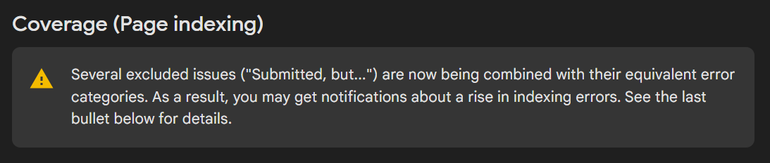However: These error class notifications do not contain sufficient detail. The email might let you know that there is an indexation error - but you won't know exactly what type of error. Google have at least 13 potential errors in this class alone. Their notification won't tell you if it's just a Discovered - not indexed or a Server error - 5xx - which makes it much harder to prioritise when you need to dig deeper or use these as a fallback monitoring.