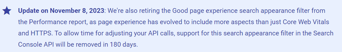 Good Page Experience filter in GSC, discontinued as of November 2023