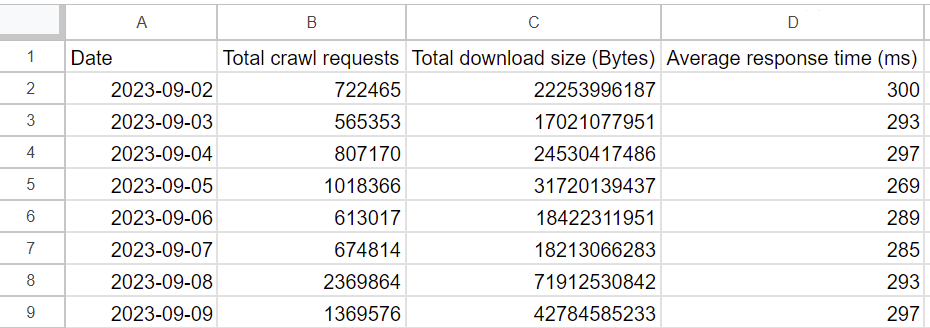 Crawl Stats are, just as elsewhere in Search Console, sampled - and when you export the limited amount of data, you don’t get the response times or crawl attempts per URL. The Crawl Stats export contains two tabs. The first listing average response times for all crawl requests per date for the last 90 days: