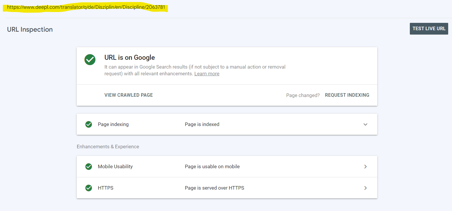 We can also find the URL in Google Search - another indicator that at least what the URL inspection tells us about the URL’s indexation status is true.