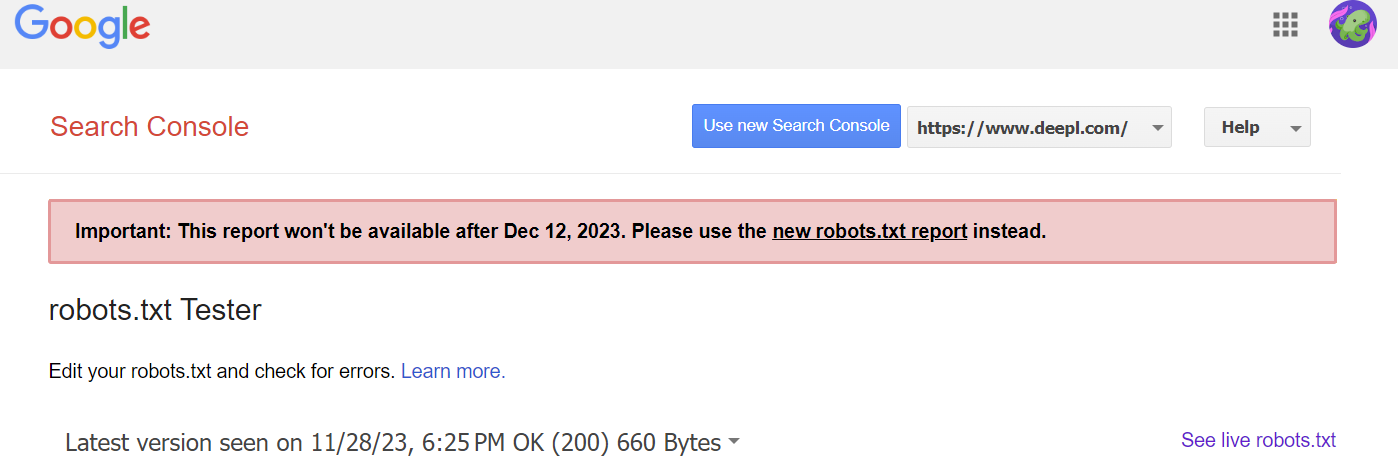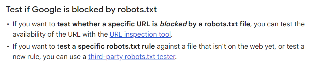 The newly introduced robots.txt Report, for instance, does not allow you to test changes to your robots.txt anymore; Google’s documentation now even links to Google Search where they reference cases where you may want to validate your robots.txt file.