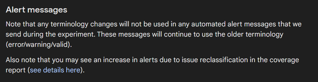 Also, if they make any changes to classifications or labels, these changes might not be used consistently throughout the Search Console ecosystem. If you are lucky, they inform us somewhere in their documentation: