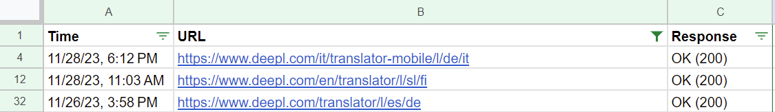 The second tab gives you a limited set of 1,000 URLs, date and time when they were crawled, and the status code they responded with - but not their response time.