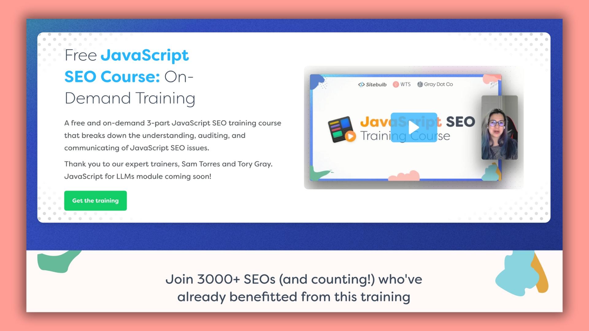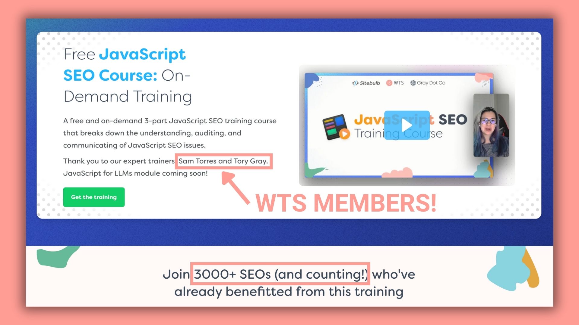The insights gathered directly shaped a free JavaScript SEO Training Series in partnership with WTS and The Gray Dot Co, which later evolved into an on-demand course.