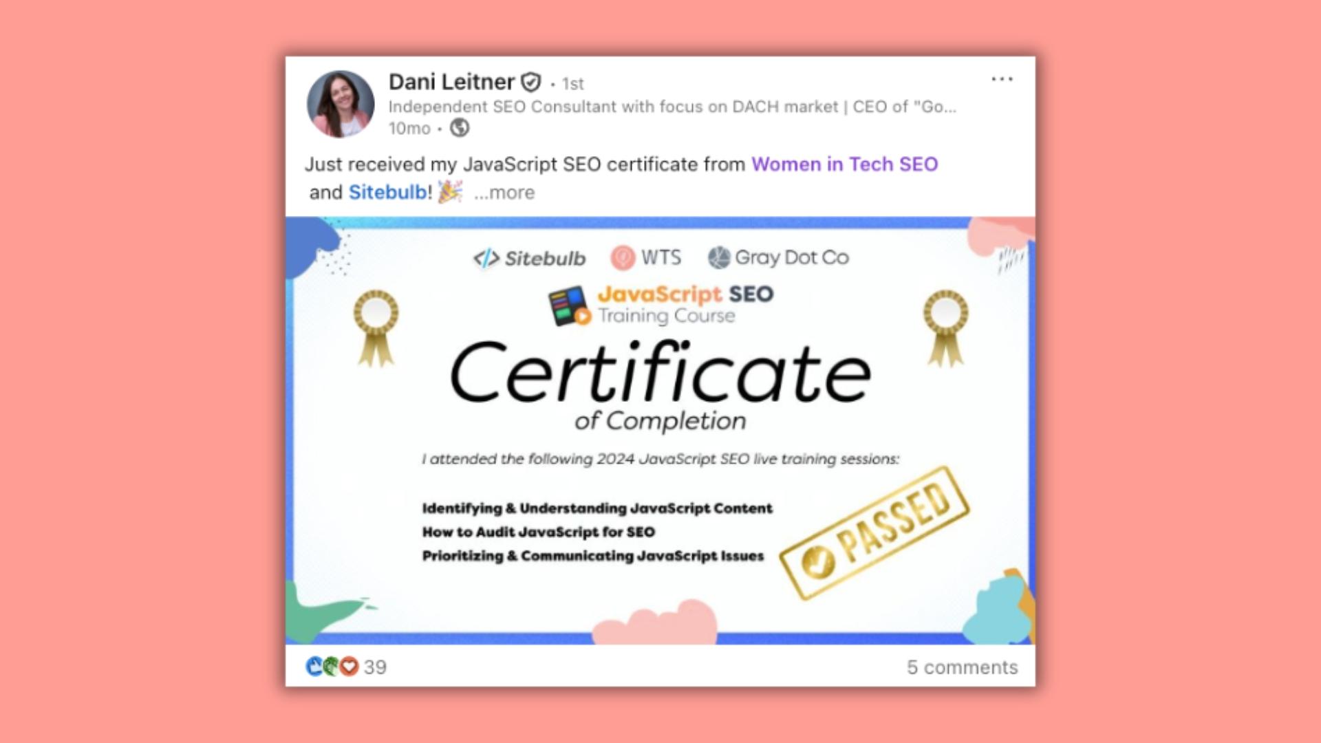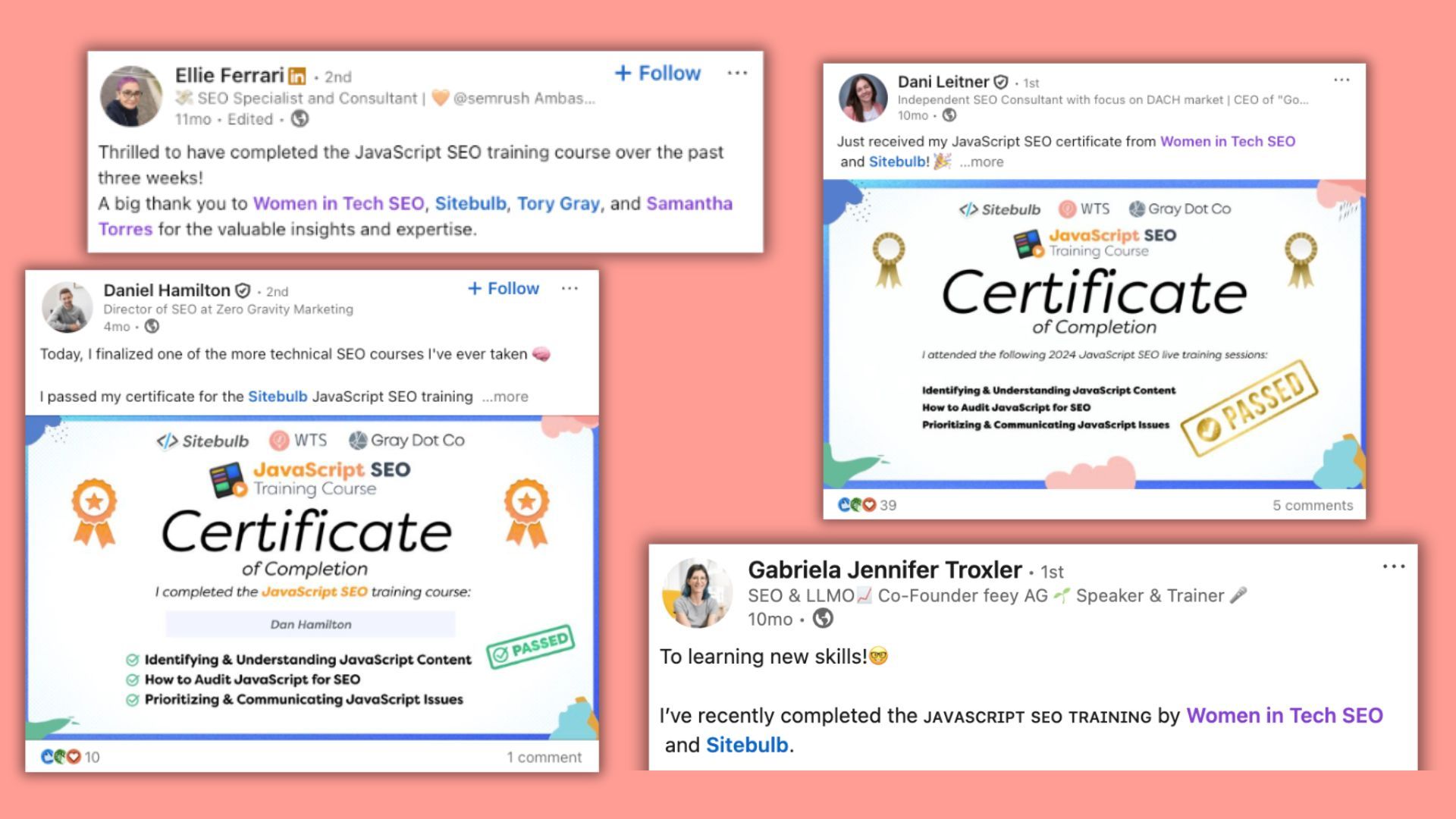 Community members proudly shared their JavaScript SEO certificates, helping the training spread through genuine word-of-mouth while also earning valuable brand mentions for Sitebulb, the trainers, & Women in Tech SEO.