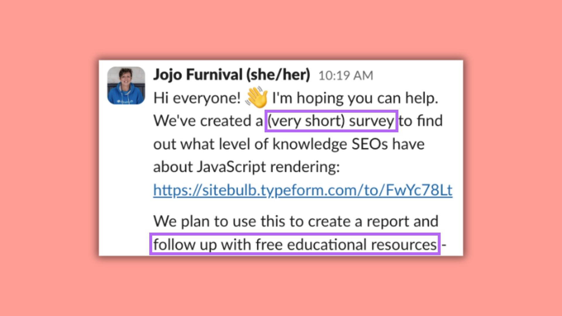 ✔️ Put out an ask with a clear return: Jojo invited the community to share their challenges around JavaScript SEO, with the promise of creating something valuable in response.
