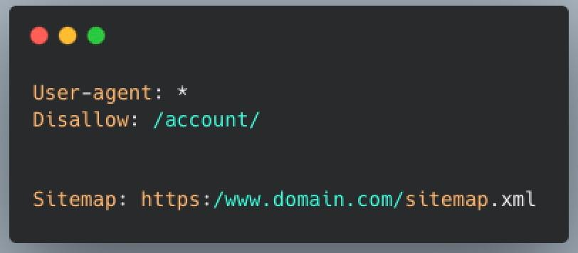 Screenshot of a robots.txt file in a code editor window, showing user-agent rules and including a sitemap link to https://www.domain.com/sitemap.xml.