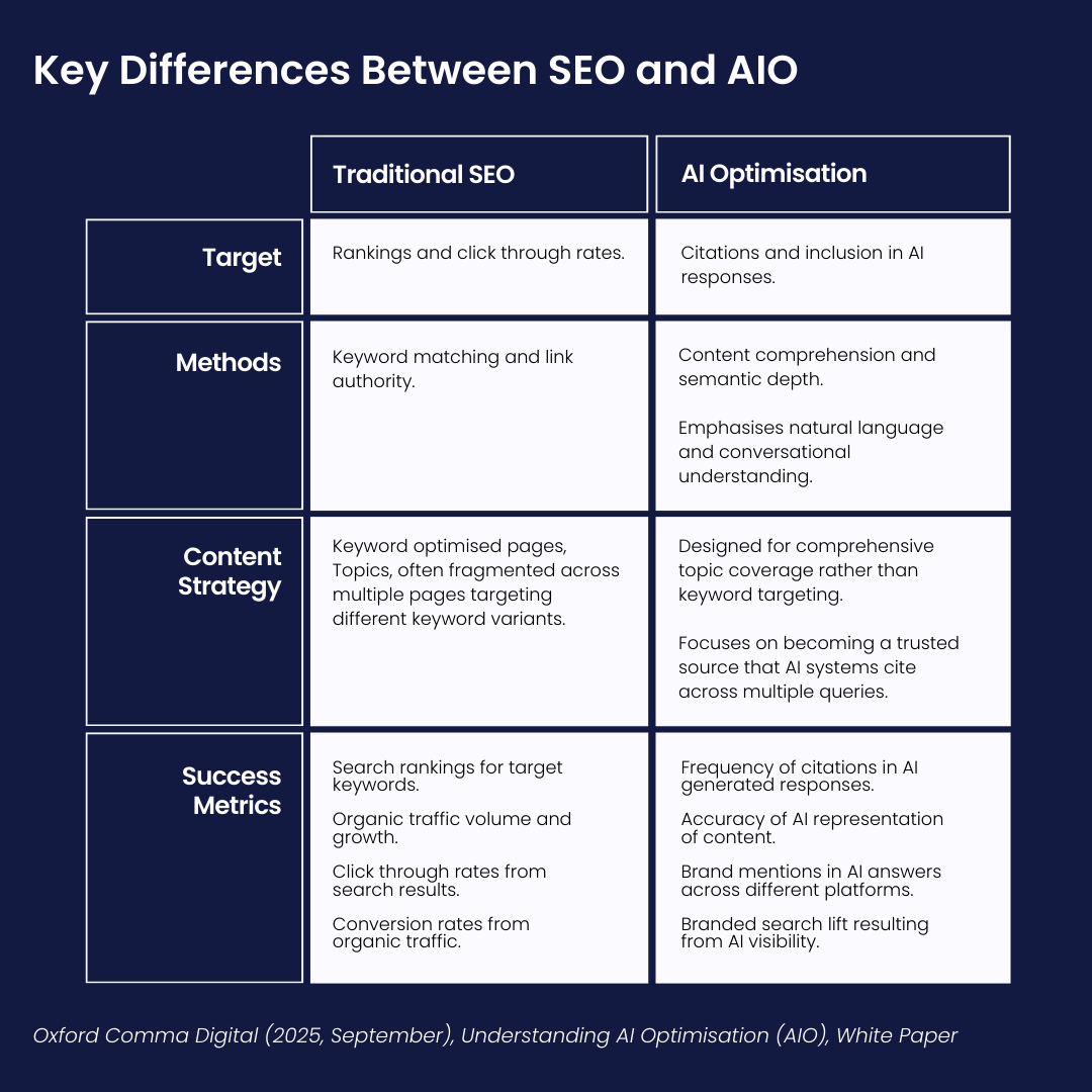 Alt text: Table showing the difference between traditional SEO and AI Optimisation