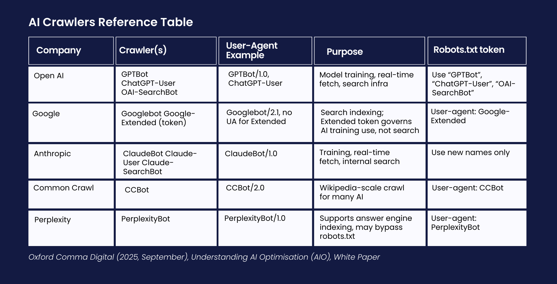 Alt text: Table showing the different AI crawlers and their purpose
