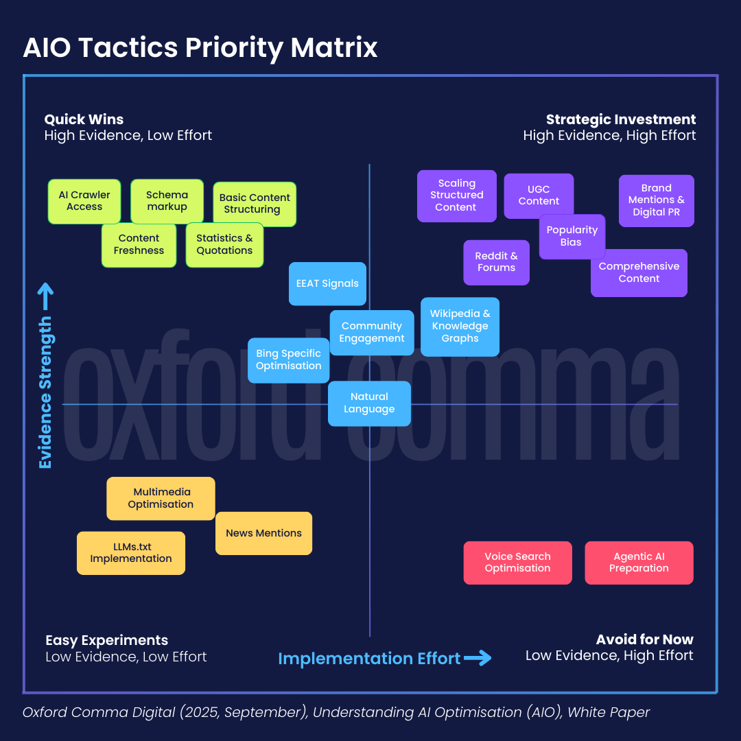 How should you prioritise your AIO work? The AIO Tactics Priority Matrix is what we’re using internally at Oxford Comma right now. It serves as directional guidance, not a definitive recipe, and will evolve as the field matures.