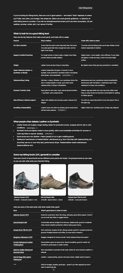 Alt text: ChatGPT response to query 'best hiking boots'