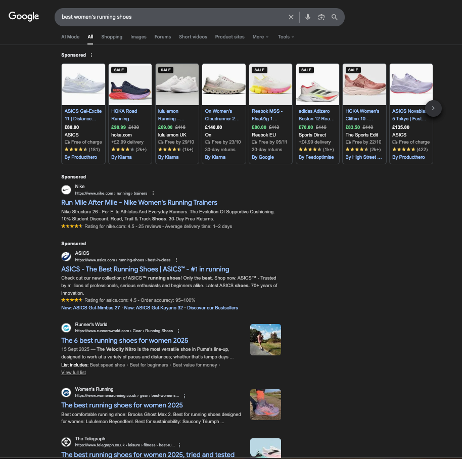 Alt text: Google organic search results for the query 'best womens running shoes'.