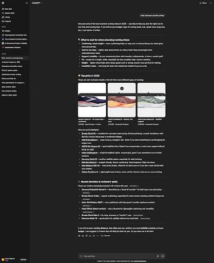 Alt text: ChatGPT screenshot for the query 'best womens running shoes'.