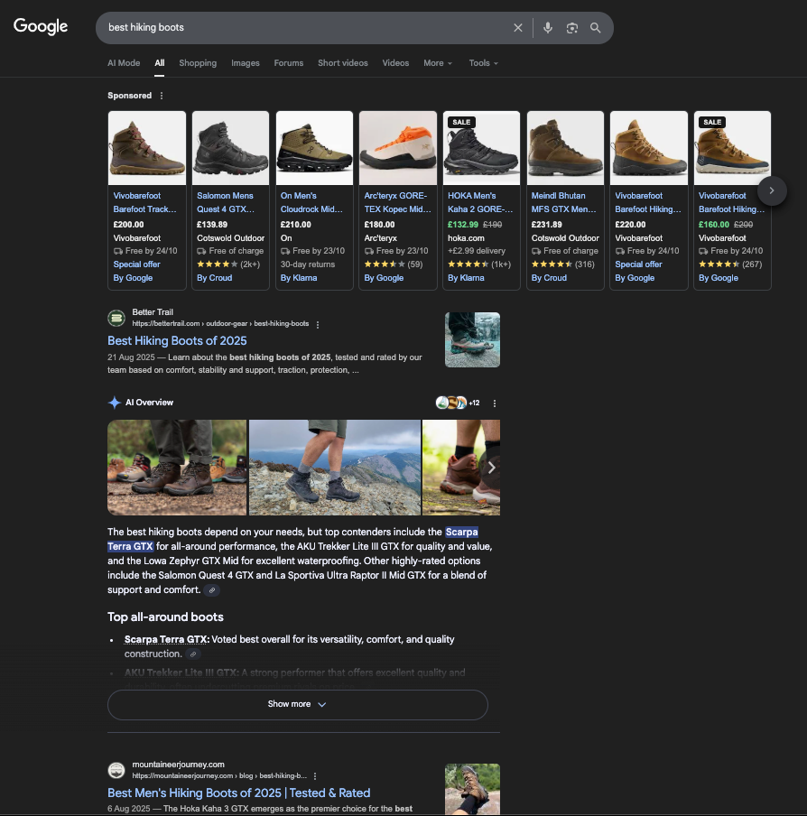 Letâs take the query âbest hiking bootsâ as an example. In the past we may have viewed this as an informational query, and expected to see links to reviews, comparisons, and guides. However in todayâs search landscape we are seeing hybrid results, with product recommendations, guides and FAQs surfaced together: