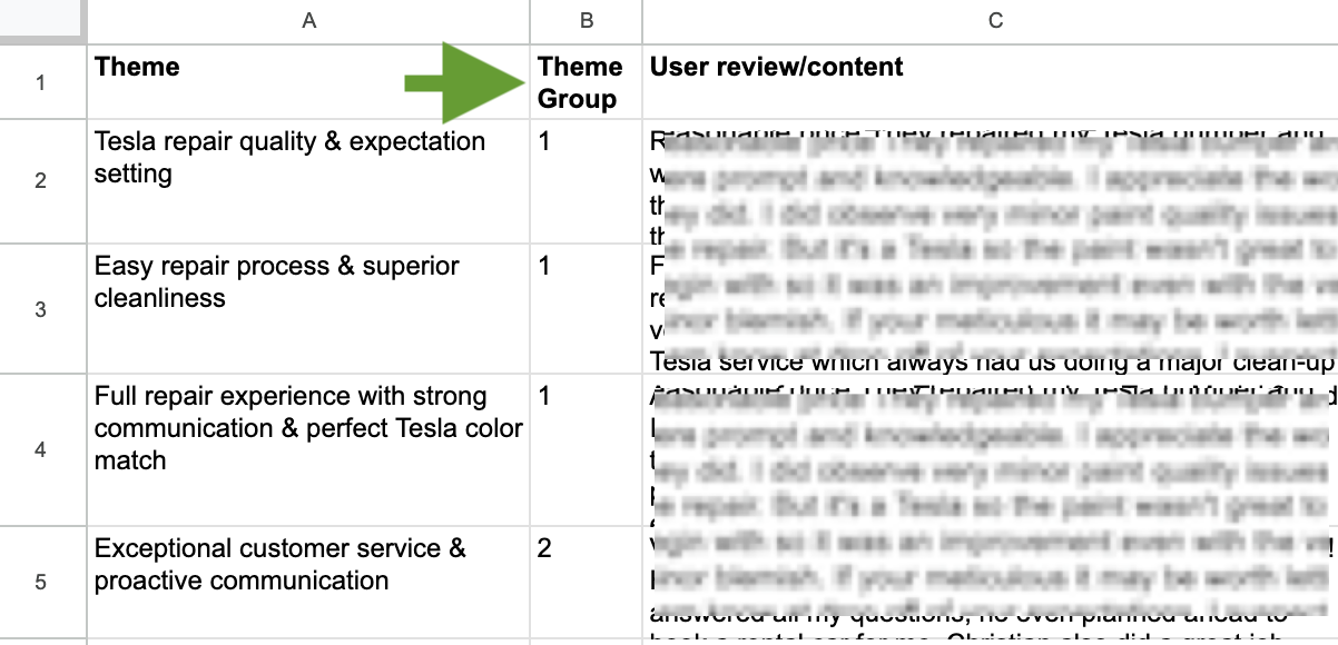 You'll get a table organized by review theme, review content, content opportunities, and user concerns. Everything will be in one place and this is what it will look like: