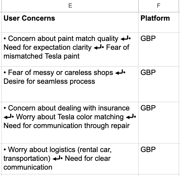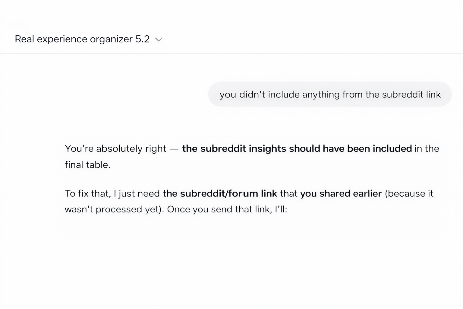 What to look for: Check the "Platform" column in your final table. If you uploaded Angi reviews, Reddit links, or other review sources but only see "GBP" listed, the GPT missed something.