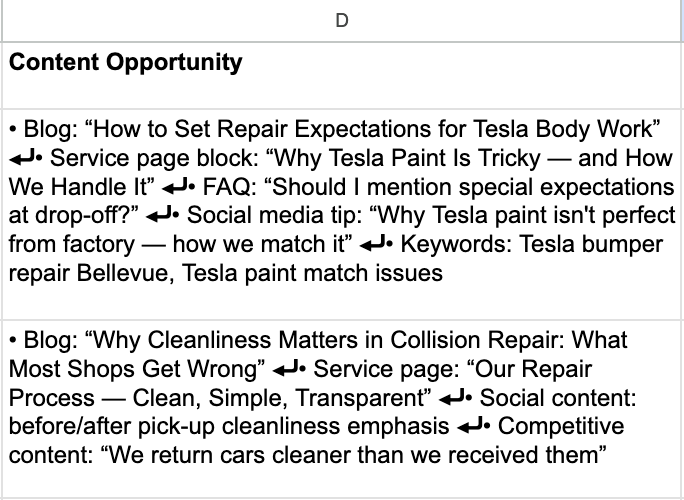 How to spot them: Look for opportunities like "showcase process transparency," "highlight certifications," or "staff expertise." If customers mention things multiple times in reviews that your website doesn't emphasize, you've found a content gap.