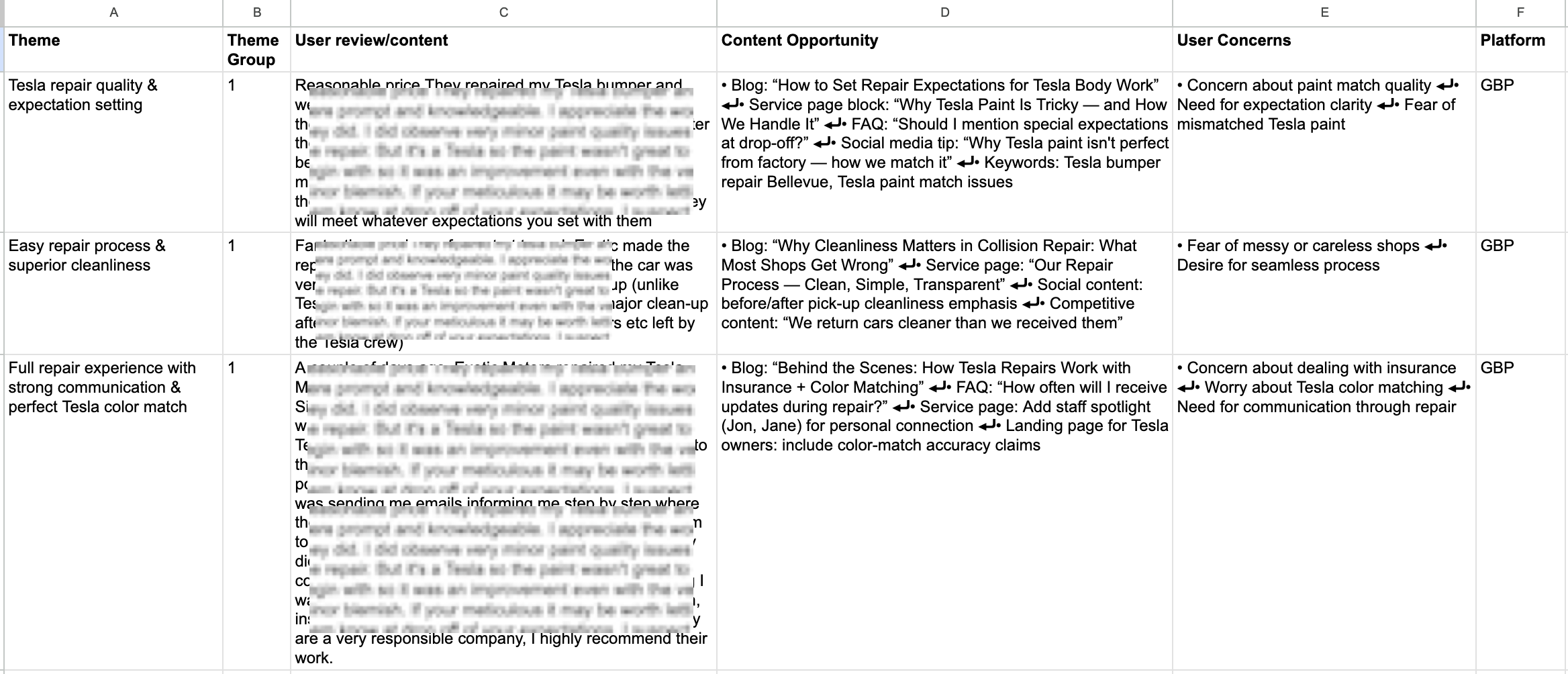 You're done. The GPT organizes everything into one table: review themes, actual review content, SEO content opportunities, and user concerns. Copy/paste it into your own spreadsheet and format it however you like.
