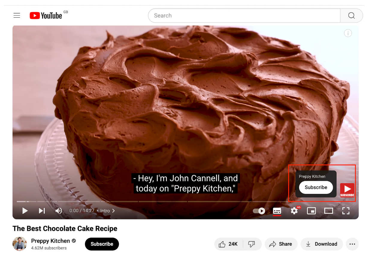 We’ll edit our video and ask viewers to comment on their favourite cooking chocolate brands during the "Ingredients" segment. Using YouTube Analytics, we know the Cooking chapter is the most engaging one for viewers. So we’ll add a subscribe CTA to it. Or better yet, let’s add that “Subscribe to all of our videos” just like Preppy Kitchen has done.