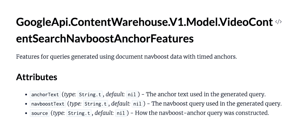 But how relevant is this when we are talking about video content in the Google SERPs? Two interesting places Navboost pops up in relation to video are both connected to anchors: