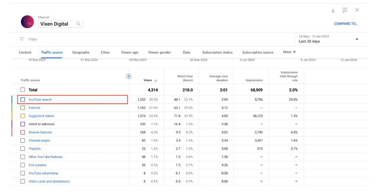 Step 3: Check the Traffic Source and choose YouTube Search. Digging into the rest of the sources can also be useful but unfortunately, Google Search that’s listed under External won’t give you a query breakdown.