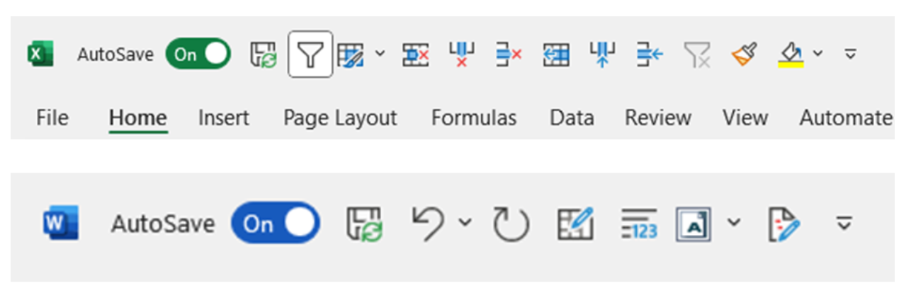This is what my Excel ribbon looks like ā easy filtering and table formatting, and fast ways to add and remove cells. My Word ribbon has instant access to tools I use every day like word count, document styles, and tracked changes.