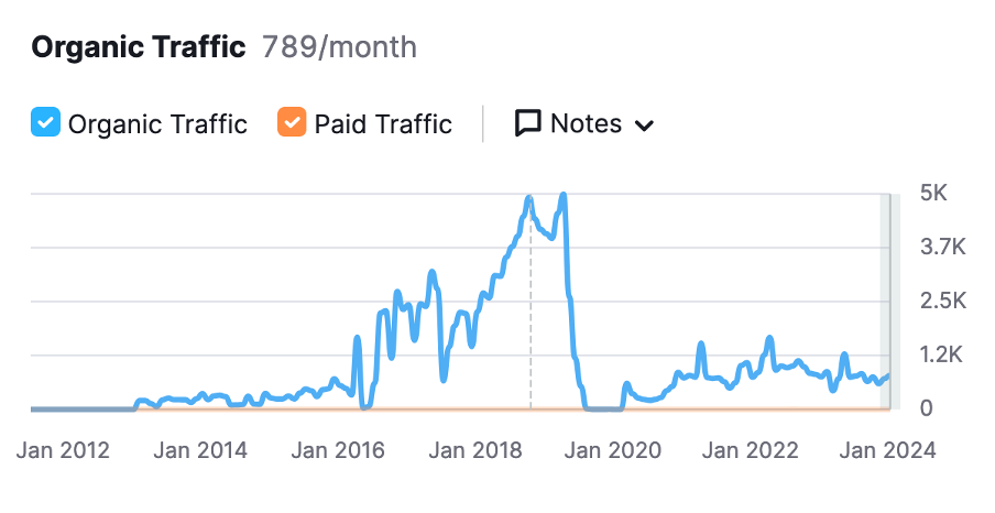 Screenshot of organic traffic graph from SEMrush shows traffic grew steadily to about 5k in 2019, then fell sharply to 0 and never fully recovered.