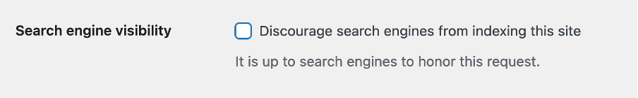 Search Engine visibility setting with an unticked checkbox labeled “Discourage search engines from indexing this site”.