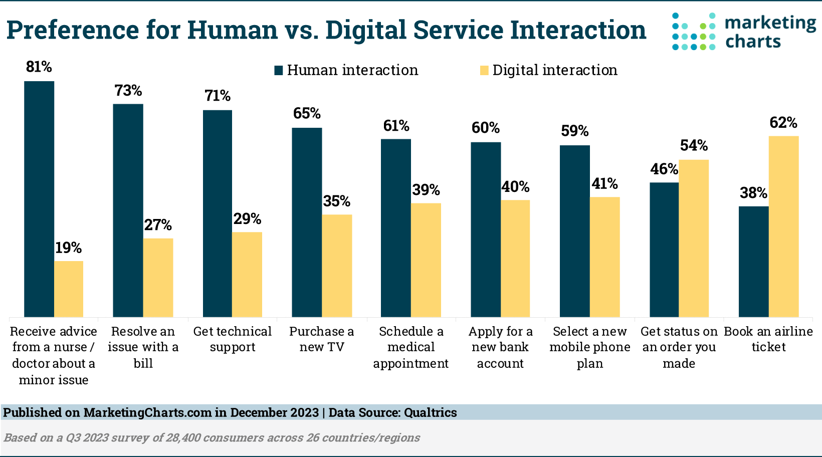 According to research collected by Qualtrics, and published in MarketingCharts, end users prefer to deal with a person when making decisions or asking questions across most fields.