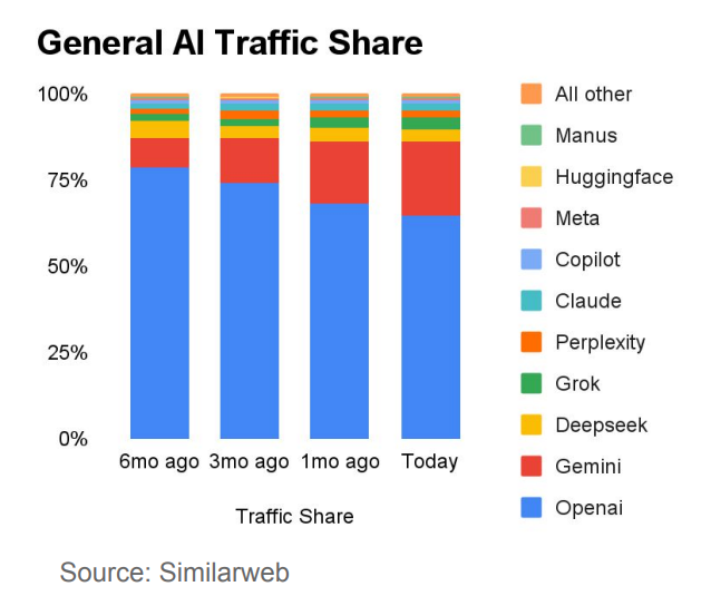 Source: Similarweb: Global AI Tracker (2026) Gemini AI traffic share growth chart: 5.7% to 21.5% in 12 months, source Similarweb