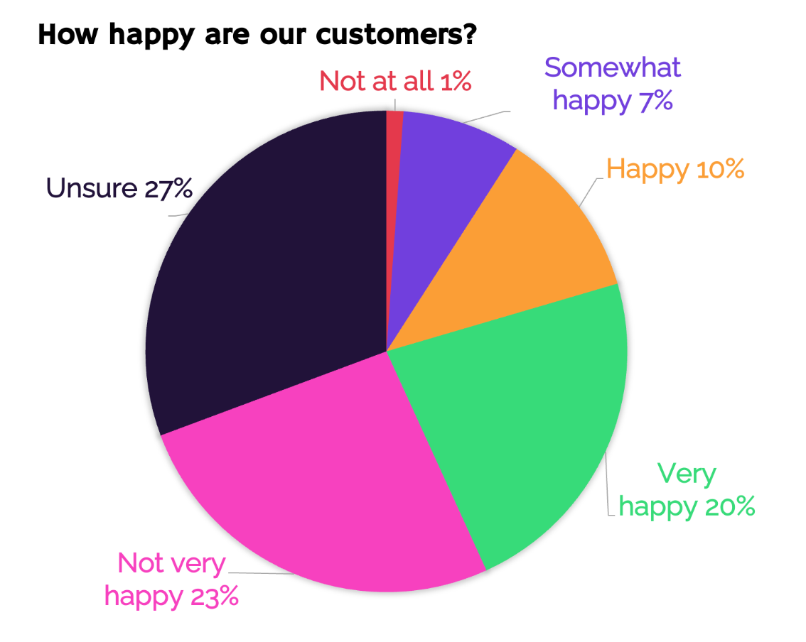 A pie chart with the title “How happy are our customers?”. Clockwise: Not at all 1%, somewhat happy 7%, happy 10%, very happy 20%, not very happy 23%, unsure 27%.