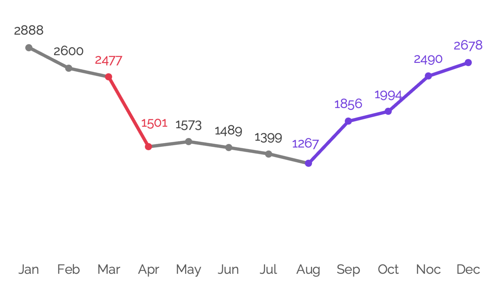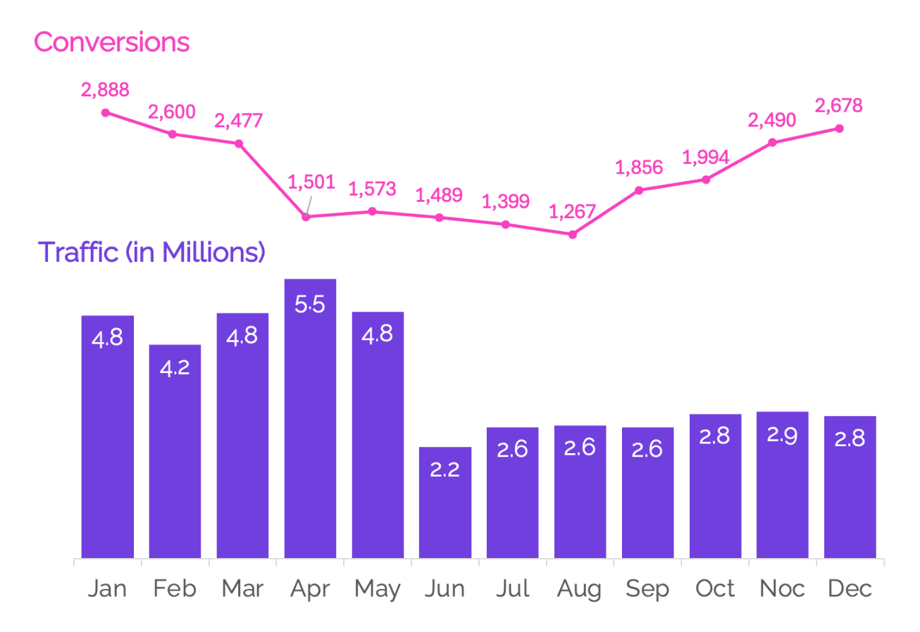 A line graph which uses color to tell the story. In months where conversions dropped the line and data labels are red, then in the months when conversions recovered the line and data labels are purple.