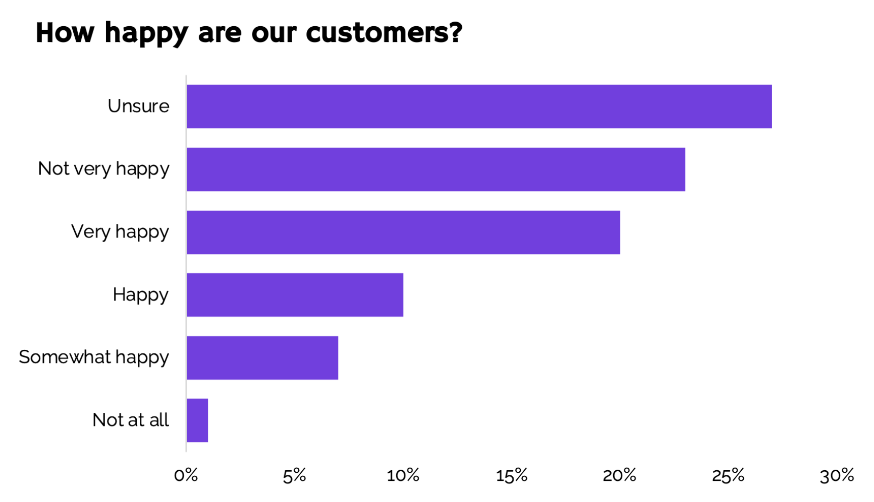 A bar chart with the title “How happy are our customers?”. From top to bottom: Unsure 27%, not very happy 23%, very happy 20%, happy 10%, somewhat happy 7%, not at all 1%.