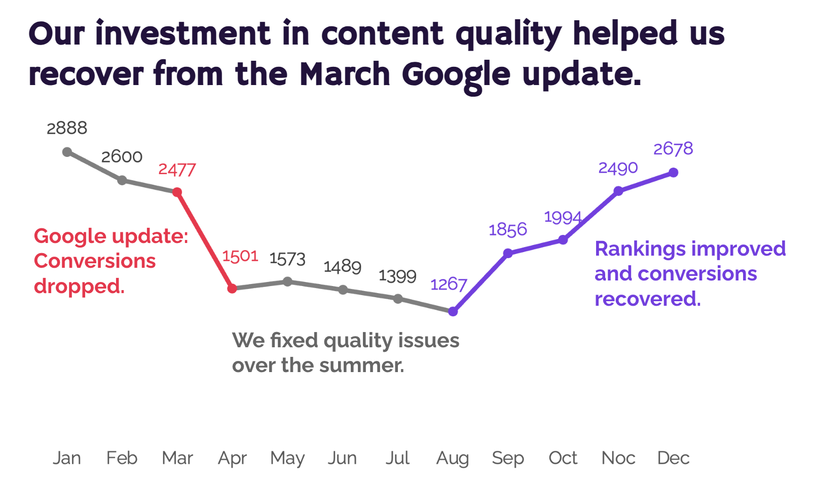 A line graph which uses color and annotations to tell the story. The chart is titled: “Our investment in content quality helped us recover from the March Google Update”. In months where conversions dropped the line and data labels are red and the annotation reads: “Google update: Conversions dropped”. In the months where conversions remained reasonably steady, the line and data labels are grey, and the annotation reads: “We fixed quality issues over the summer”. In the months when conversions recovered the line and data labels are purple, and the annotation reads: “Rankings improved and conversions recovered”..